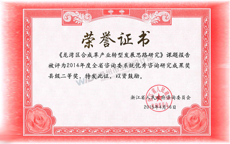 龍灣區(qū)合成革產(chǎn)業(yè)轉(zhuǎn)型發(fā)展思路研究 省咨詢委系統(tǒng)優(yōu)秀咨詢研究成果獎縣級二等獎