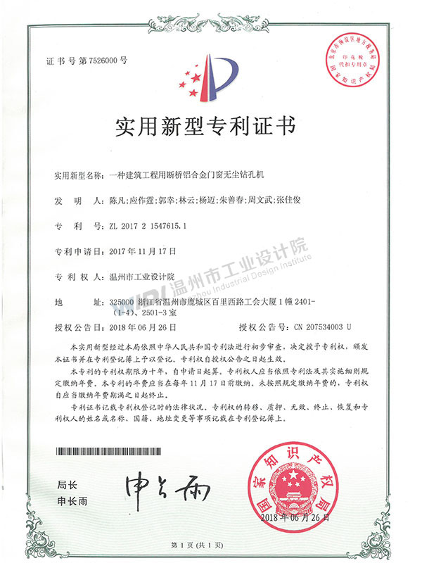 一種建筑工程用斷橋鋁合金門窗無(wú)塵鉆孔機(jī)證書