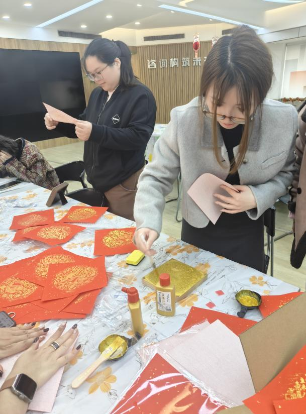 活動現(xiàn)場,布置得溫馨且喜慶,燈籠高掛、春聯(lián)映目、年花簇?fù)恚幪幯笠缰鴿庥舻墓?jié)日氣息。全體員工熱情響應(yīng),踴躍參加?;顒右潦?,大家有序簽到并領(lǐng)取了手工DIY所需的材料。此次活動準(zhǔn)備了多個富有傳統(tǒng)文化韻味的手工項目。福字 DIY 鉆石貼區(qū),員工們專注地將一顆顆閃耀的鉆石鑲嵌在特制模板上,在細(xì)致操作中,寓意吉祥的福字逐漸成型;“家和萬事興”“百福圖” 數(shù)字油畫 DIY 區(qū)域,大家依據(jù)數(shù)字標(biāo)識,用畫筆為畫布填充色彩,每一筆都飽含著對美好生活的期許。木版年畫拓印手工 DIY 處,員工們先將宣紙輕柔覆蓋在刻有精美圖案的木版上,再用蘸滿顏料的刷子均勻刷過紙面,隨后小心翼翼地揭開宣紙,一幅幅承載著歷史記憶與美好寓意的木版年畫便躍然紙上 。經(jīng)過一個多小時的創(chuàng)作,一幅幅精美的手工作品陸續(xù)誕生。這些作品不僅展示了員工們的才華和技藝,更凝聚了大家的智慧和汗水。